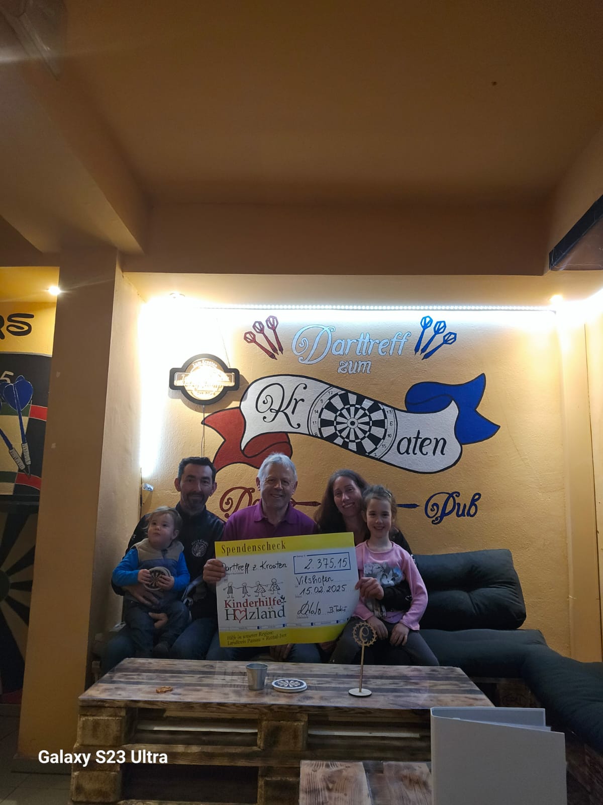 Mit viel Einsatz organisierten die Inhaber des Darttreff zum Kroaten, Davor und Bettina Tokic, zugunsten der „Kinderhilfe Holzland“, eine Veranstaltung der etwas anderen Sorte. Einen ganzen Tag lang wurde „gespickert“ was das Zeug hält und gesammelt für die Kids. Ein Teil des Startgeldes das jeder Mitspieler bezahlte, ein großer Kuchenverkauf oder Spenden von Firmen wie Arcapo Security, Revanche Vilshofen, RN Kranverleih, Greulich Spiel-und Unterhaltungsautomaten, Rudi‘s Dartshop und Duschl Pokale- haben eine Spende von 2375,15 Euro möglich gemacht. Ein großer Dank an alle die gespendet haben. Ebenfalls ein Vergelt’s Gott an alle Helferlein ob Kuchenbäcker- oder verkäufer, DJ Karaoke Andreas, die Turnierleitung und das Aufbauteam. Vorallem auch an die Dartmannschaften Jolly Jumpers, Death Eagles 1, Death Eagles 2 und die Bixn die ebenfalls zum Gelingen des aufregenden Tages beigetragen haben.