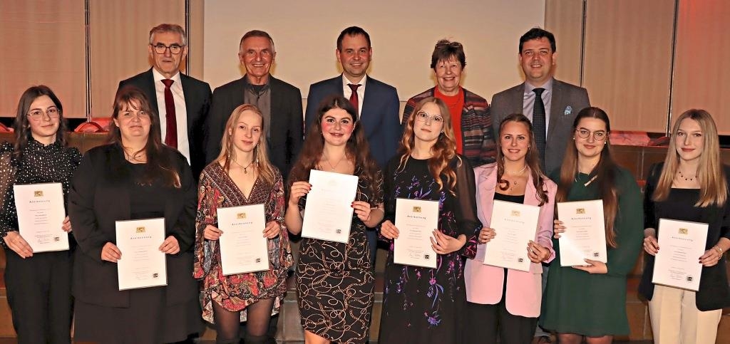 Den mit Ehrenpreisen für ihre herausragenden Leistungen bedachten Absolventen gratulierten (hinten v.l.) Schulleiter Robert Lindner, Berufsschulverbandsvorsitzender Walter Taubeneder, Landrat Raimund Kneidinger, Leitende Regierungsschuldirektorin Maria Sommerer und Passaus Bürgermeister Armin Dickl. − Foto: Brunner