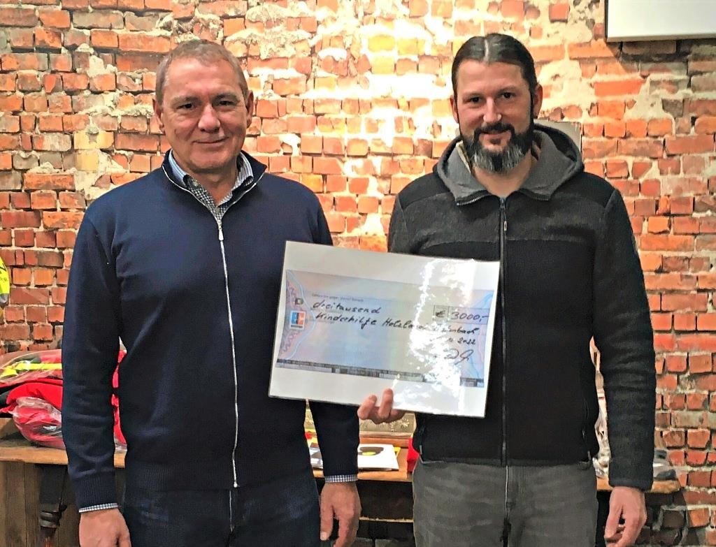 Erwin Dötter, Geschäftsführer der Firma Huber aus Tiefenbach (links), übergab den Scheck an Daniel Hutstein von der Kinderhilfe. −F.: red