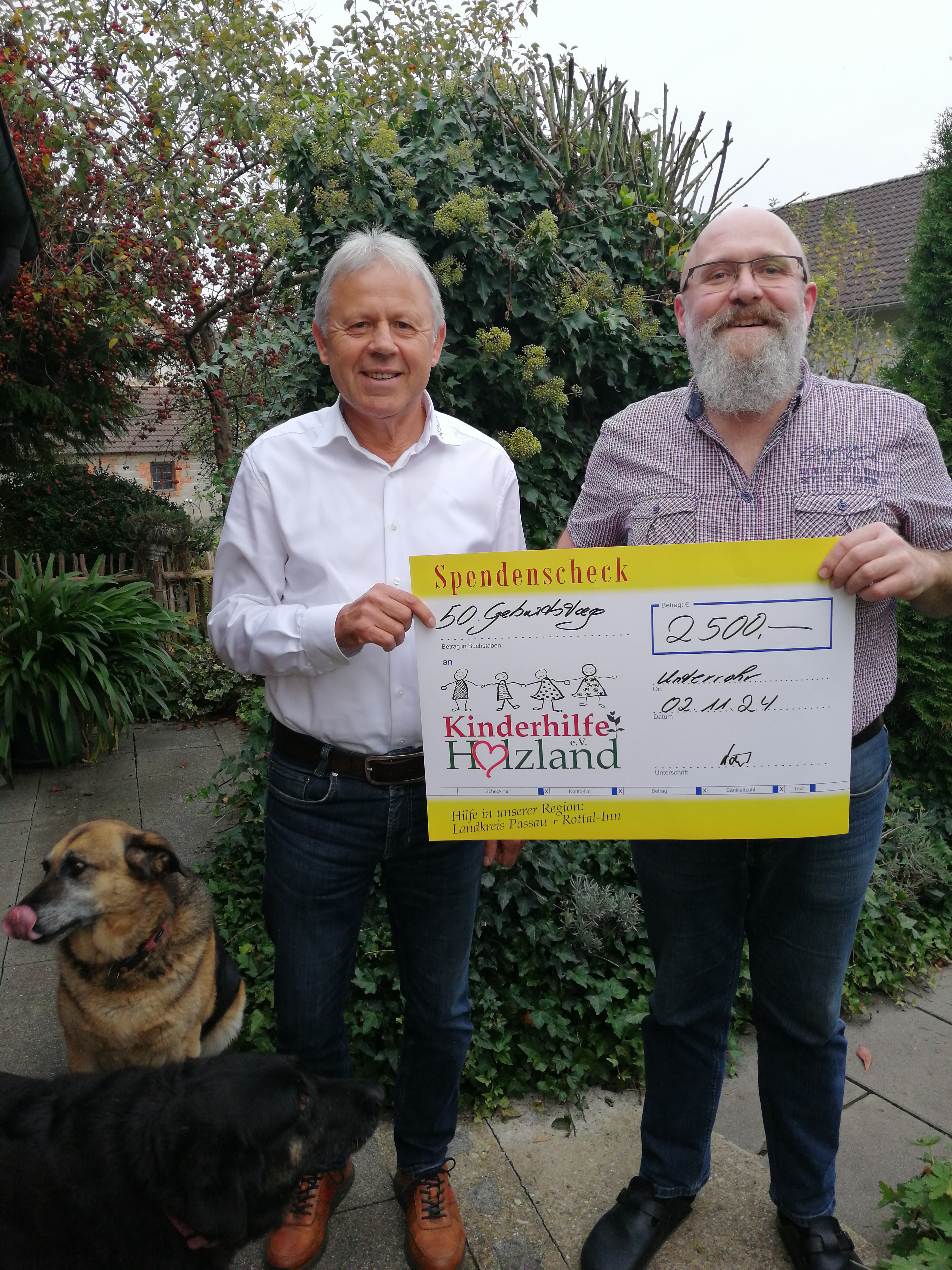 So stand es in der Einladung zum 50. Geburtstag von Hans Löw. Anstatt Geschenk zu bekommen fand er es sinnvoller, Geld für Kinder und Familien in schwierigen Lebenslagen zu sammeln. Dank der Großzügigkeit von Freunden und Familie kamen 2500,00€ für die Kinderhilfe Holzland e. V. zusammen. Den Spendenscheck übergab Hans Löw an Peter Stuiber, den Vorsitzenden der Kinderhilfe Holzland e. V.