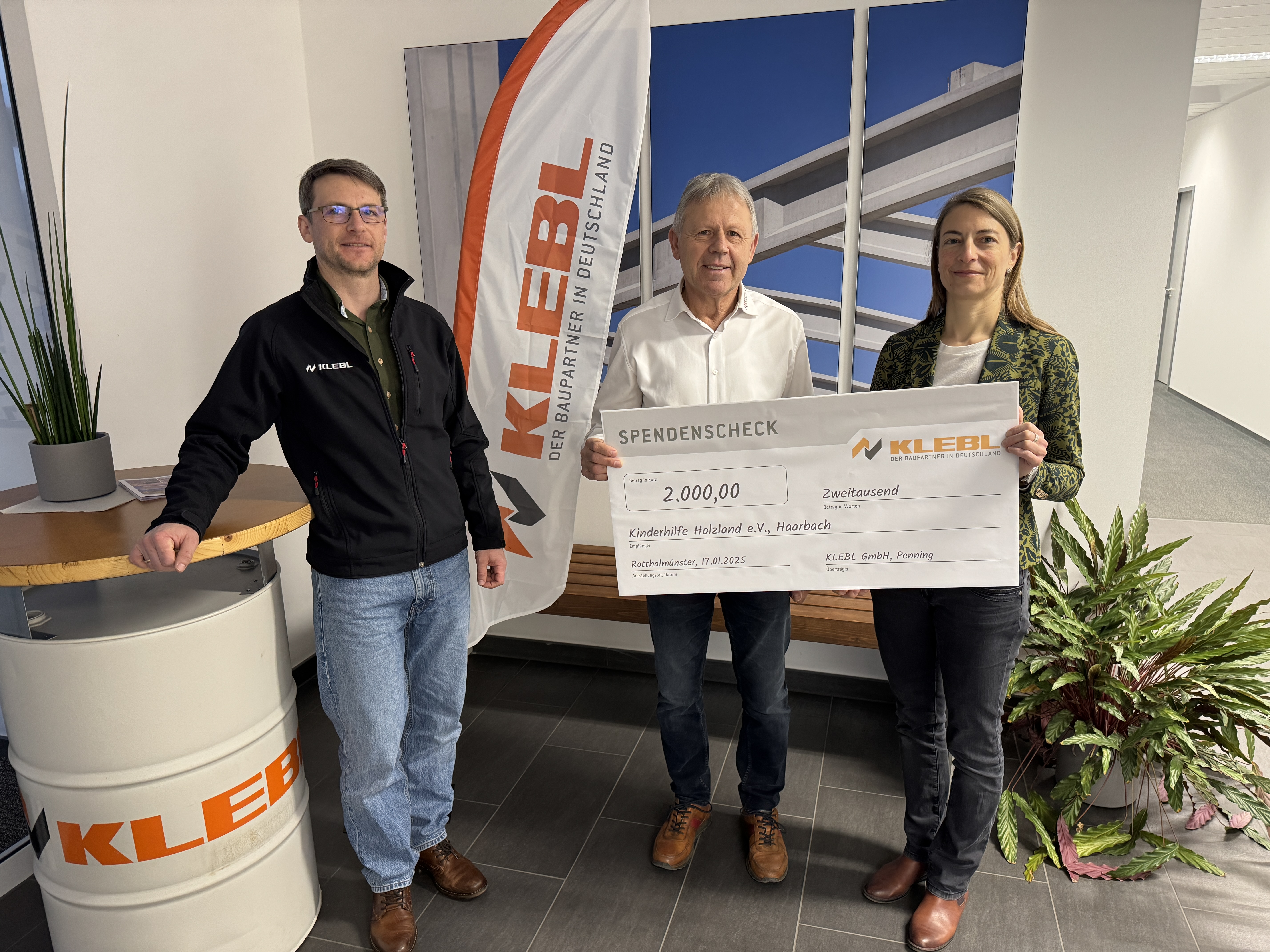 Mit einer Spendenübergabe startet das KLEBL-Fertigteilwerk Penning in Rotthalmünster in das neue Jahr. Insgesamt 2.000,00 Euro kamen für den guten Zweck, die „Kinderhilfe Holzland e.V.“, zusammen.